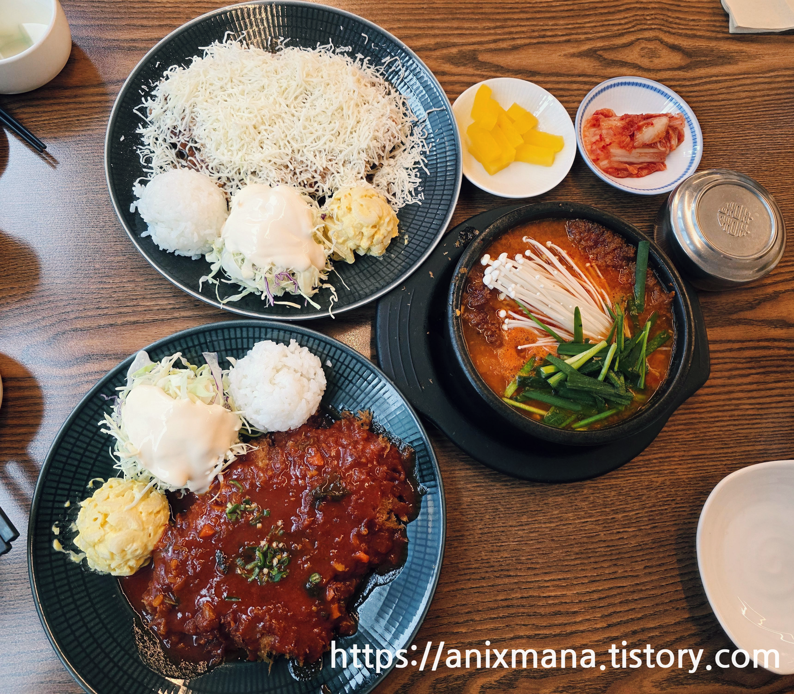 제가 여기서 좋아하는 메뉴는 떡볶이 돈까스, 김치찌개 돈까스와 매운 눈꽃치즈돈까스예요.