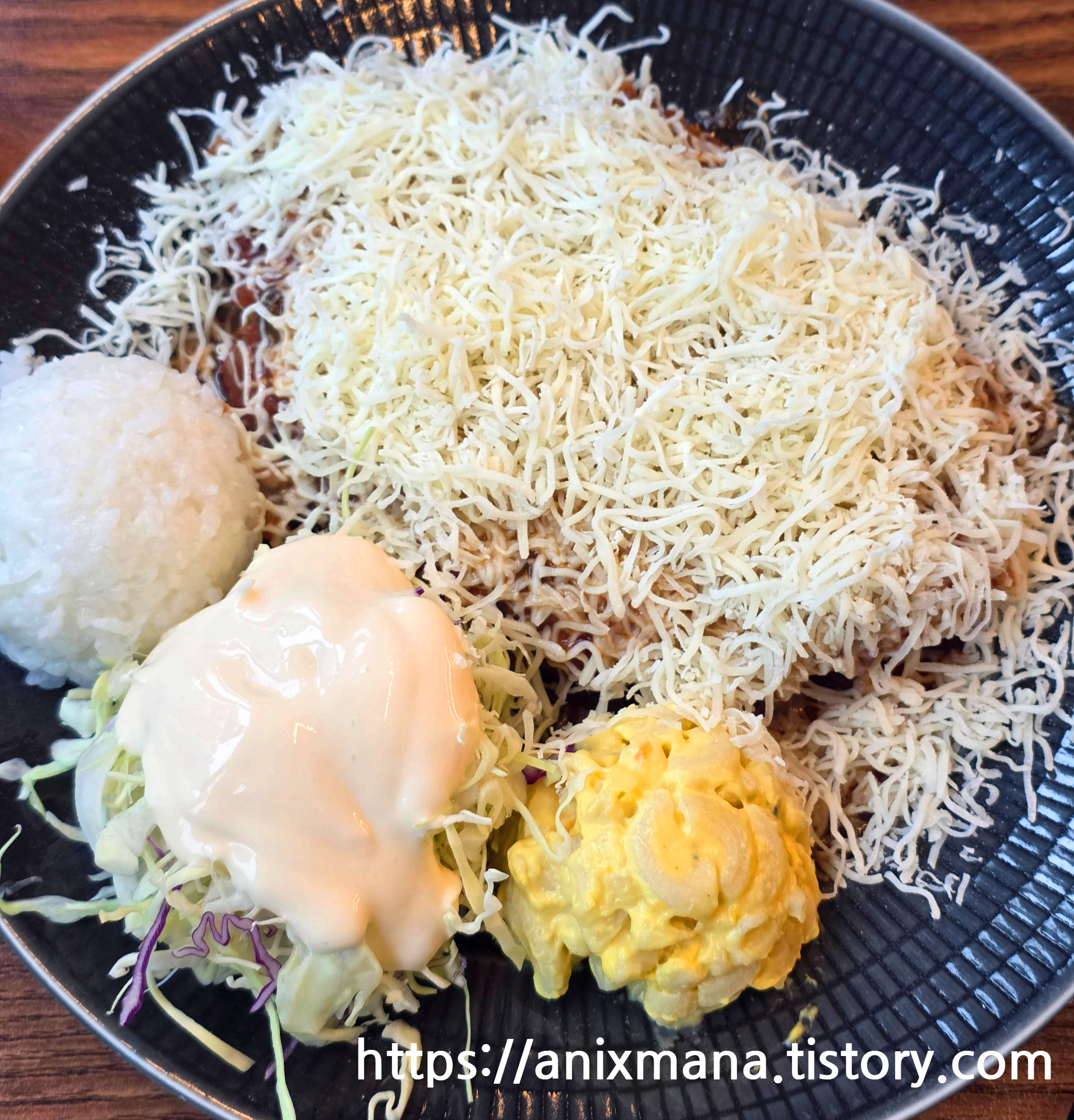 사진이.. 좀 이상하게 나왔습니다만! 치즈가 살~짝 녹으면서!!! 고소함을 더해줍니다. 하지만 느끼한 음식에 면역이 안되어 있으신 분이시라면- 좀.. 물린다..생각할 수도 있겠습니다.