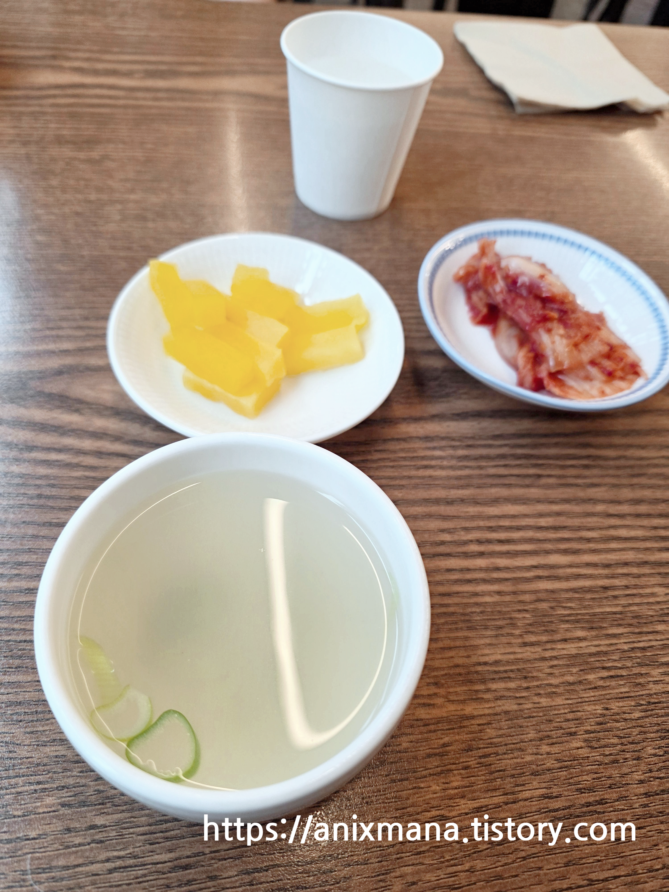 기본적으로 나오는 국물, 그냥 깔끔합니다. 단무지와 김치는 테이블 위에 있으므로 드실만큼만 꺼내 드시면 됩니다 ^^ 찝개가 뚜껑 위에 있어서... 약간 위생적으로나 보기에 좋지 않은 것이 아쉽..