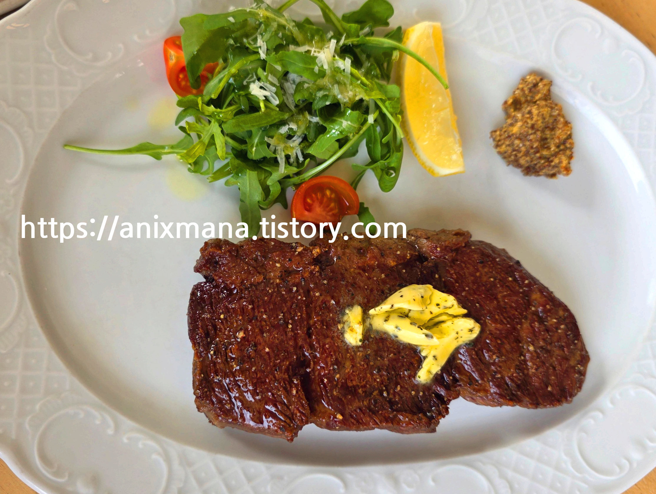 저는 핏기만 가셔도 먹는 스타일이지만 짝꿍은 절대 노노! 잘 익은 편을 선호해서- 그래? 그럼 잘익은듯한 익힘을 선호. 그래서 미디움웰던정도로...