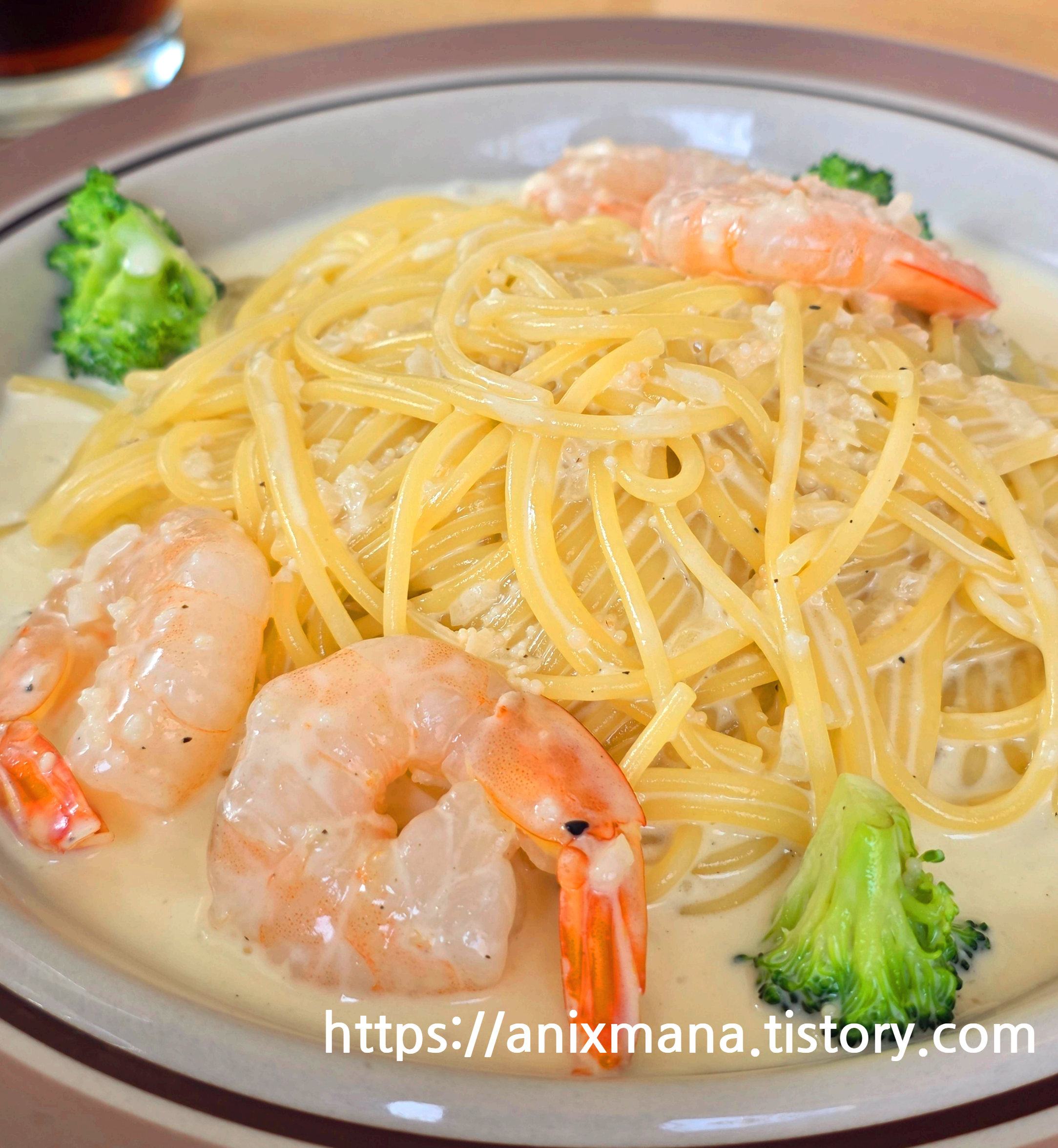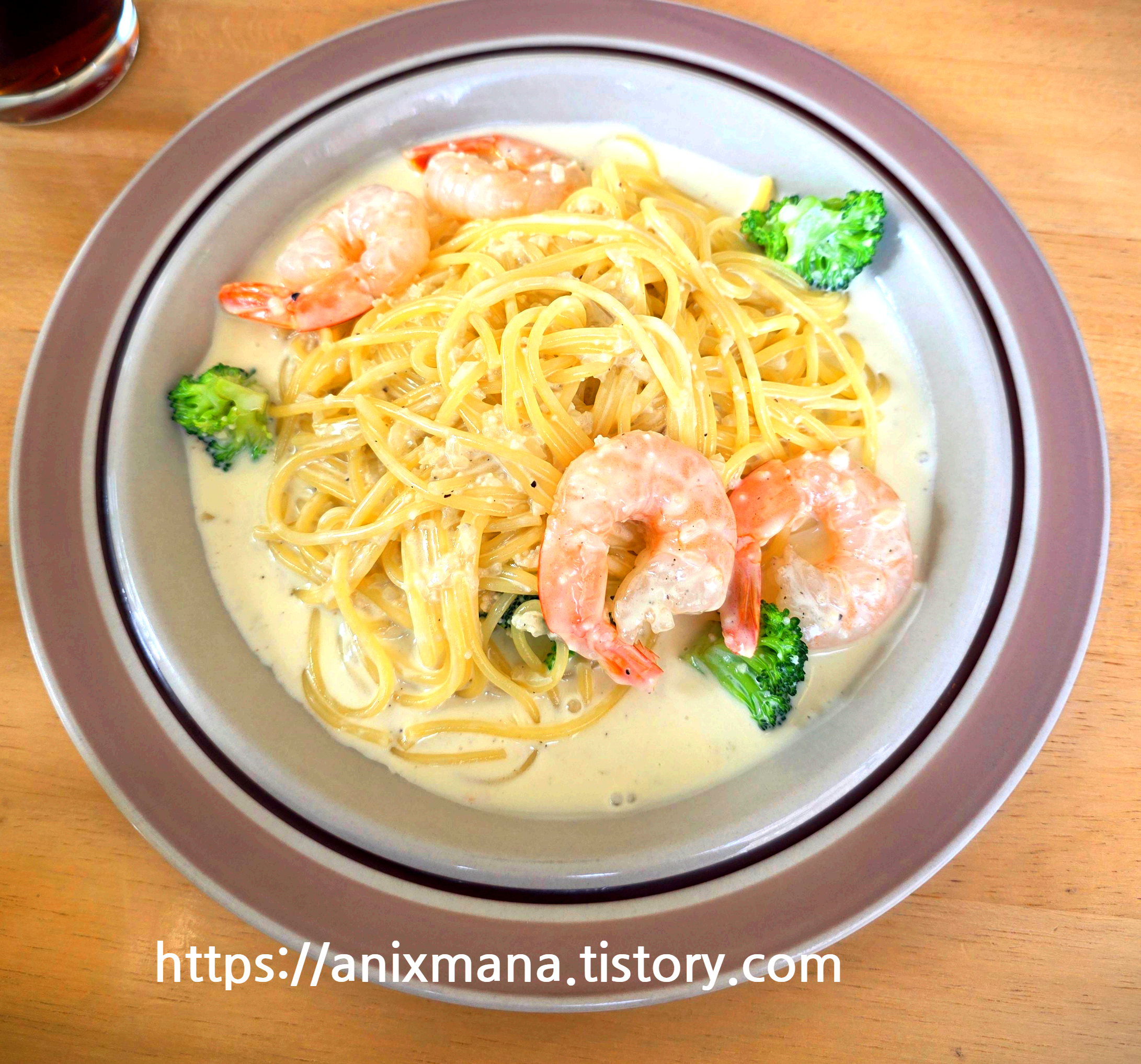 그러는사이! 새우크림파스타가 등장합니다!! 통통한 새우가 네 마리 보였어요!