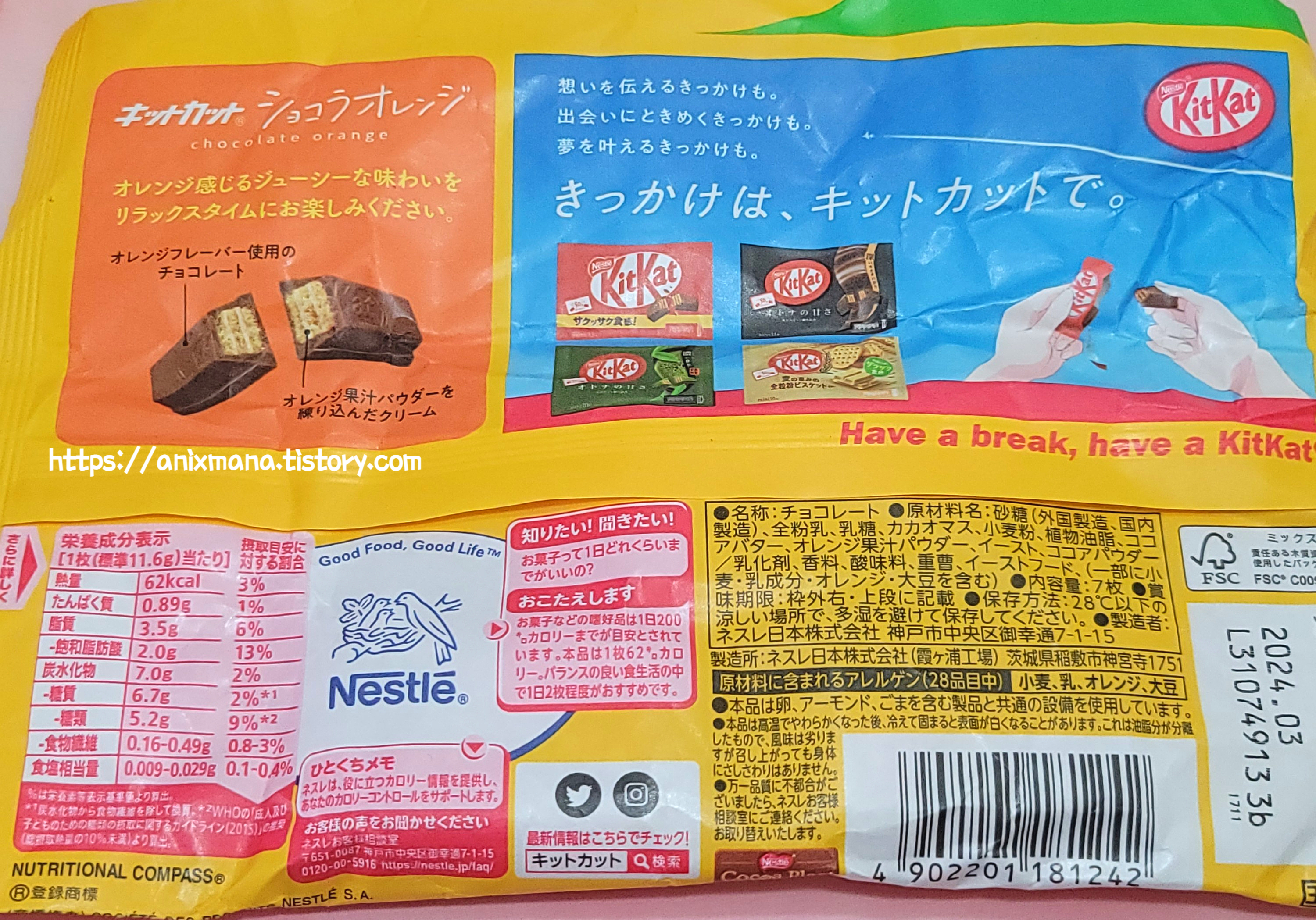 쇼콜라 오렌지라고 씌여진 포장지. 역시 뒷면에는 메시지를 적을 공간이 있습니다. 대부분의 일본산 킷캣에는 이런 자리가 있어요~