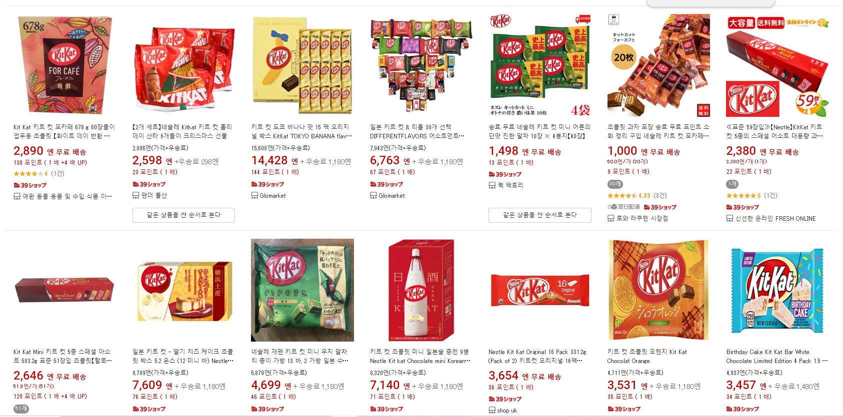 일본 대표 오픈마켓 라쿠텐에 들어가셔서 킷캣을 검색하시면 이렇게 다양한 종류의 킷캣이 쭈우우우욱~ 나온답니다!