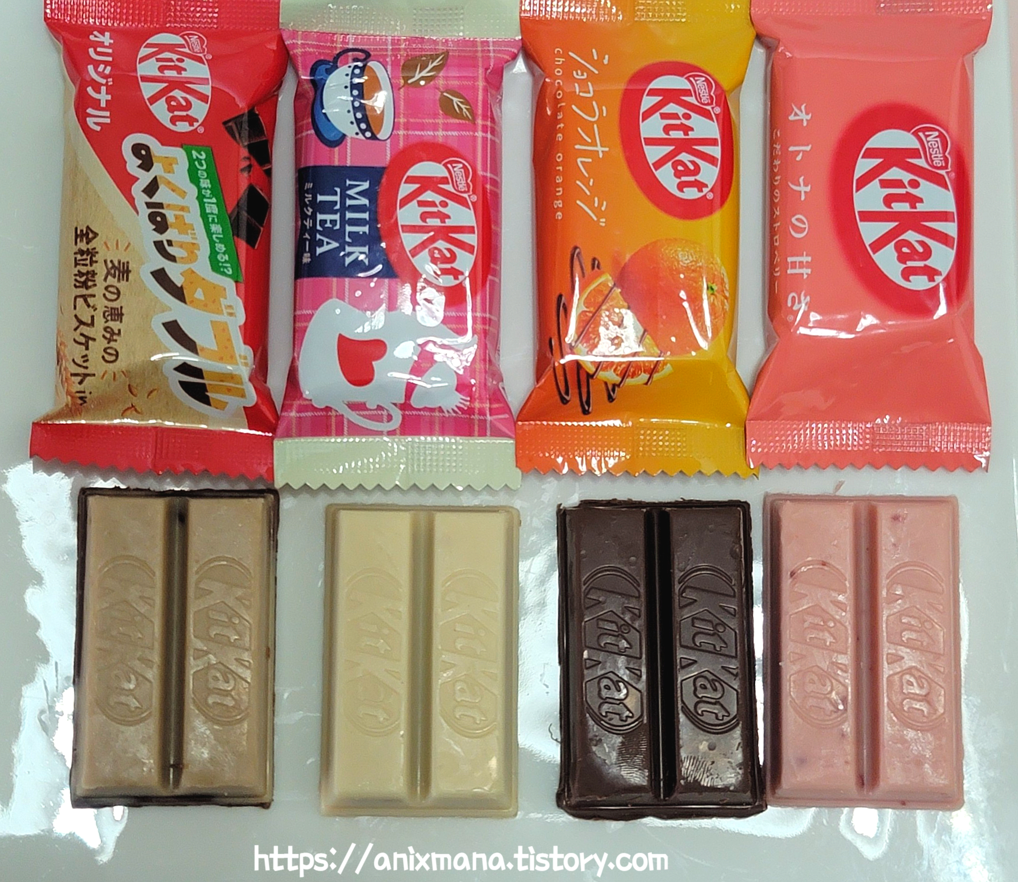 지인들에게도 나누어주면서 평가를 부탁해 보았는데요... 응? 굳이 하는 반응이 대부분이었던 네 종류.. 미안.. 내가 잘못 산거니? 무슨 제품인지 모르고 먹는다면 킷캣인지 전혀 알 수 없을 것 같다고 합니다.